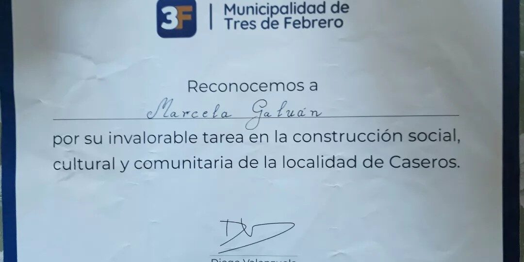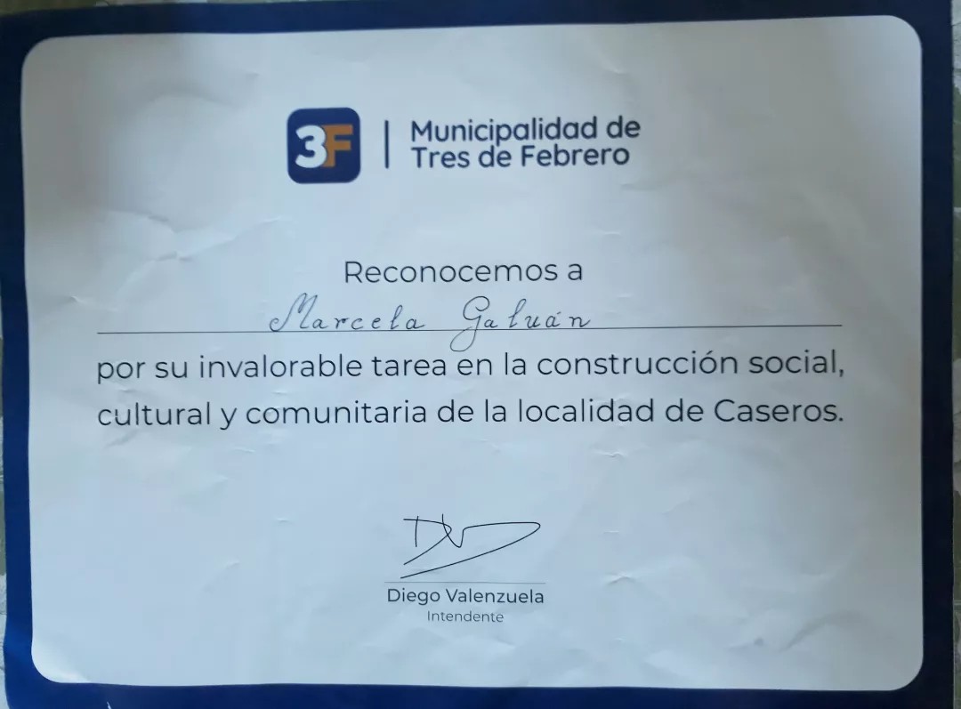 Reconocimiento por mi gestión cultural y comunitaria El Municipio de Tres de Febrero me entregó esta distinción por mi tarea en la construcción social, cultural y comunitaria de la localidad de Caseros.